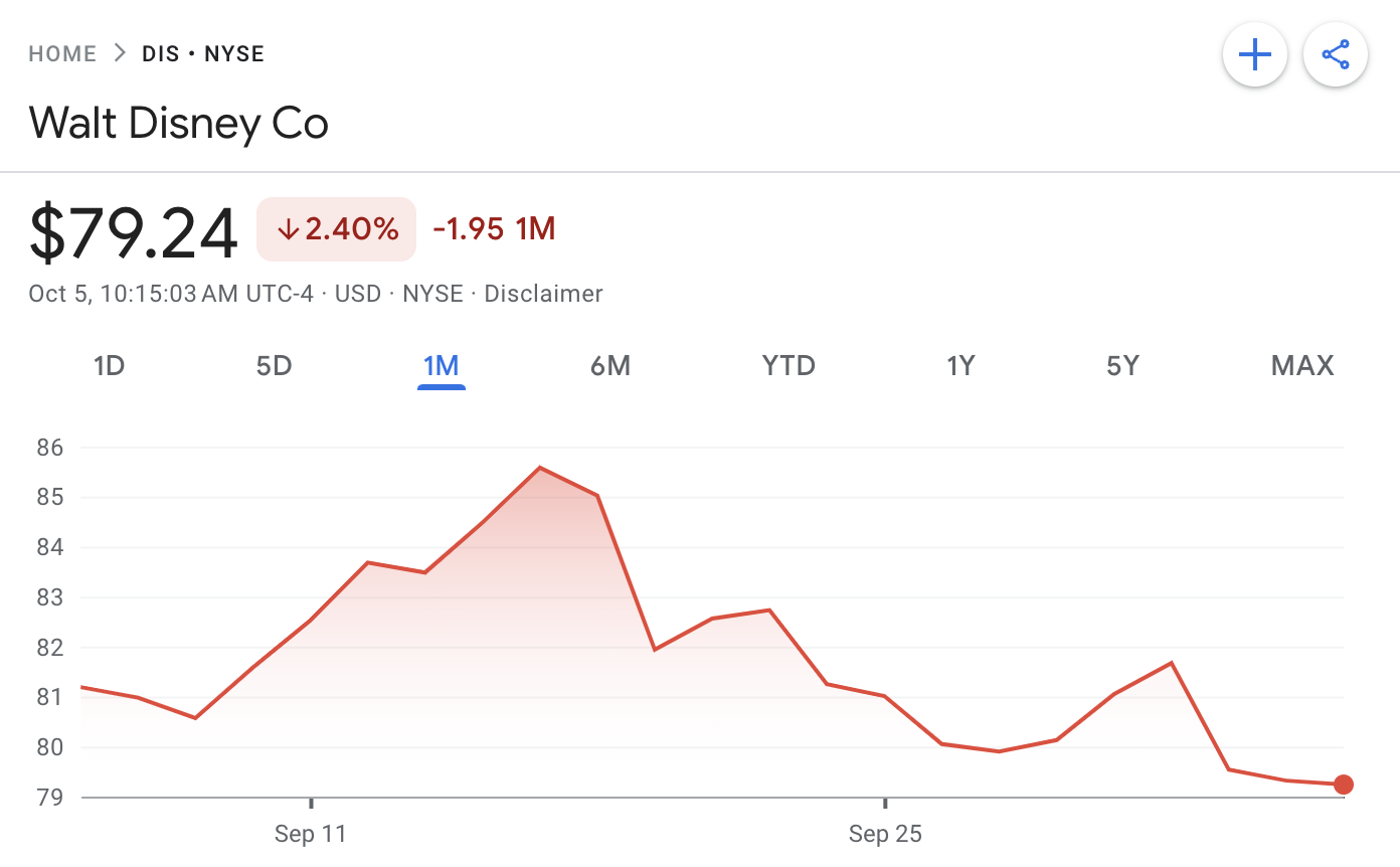 As of the morning of October 5th, Disney stock (NYSE: DIS)prices were trading just below $80 per share at $79.24. According to data from Google Stocks, it was priced even lower at market close on October 4th at around $78.73. This is the lowest we’ve seen DIS priced in nearly 10 years — since October 2014.