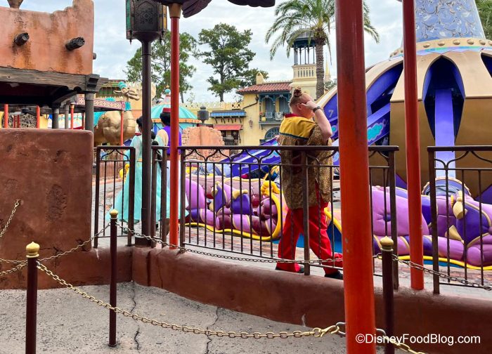 So if you want a chance to experience this magical moment, you’ll need to rope drop Magic Kingdom and head straight to Adventureland. You’ll want to be the first to ride The Magic Carpets of Aladdin. Why? Well, each morning, Aladdin and Jasmine show up to ride!