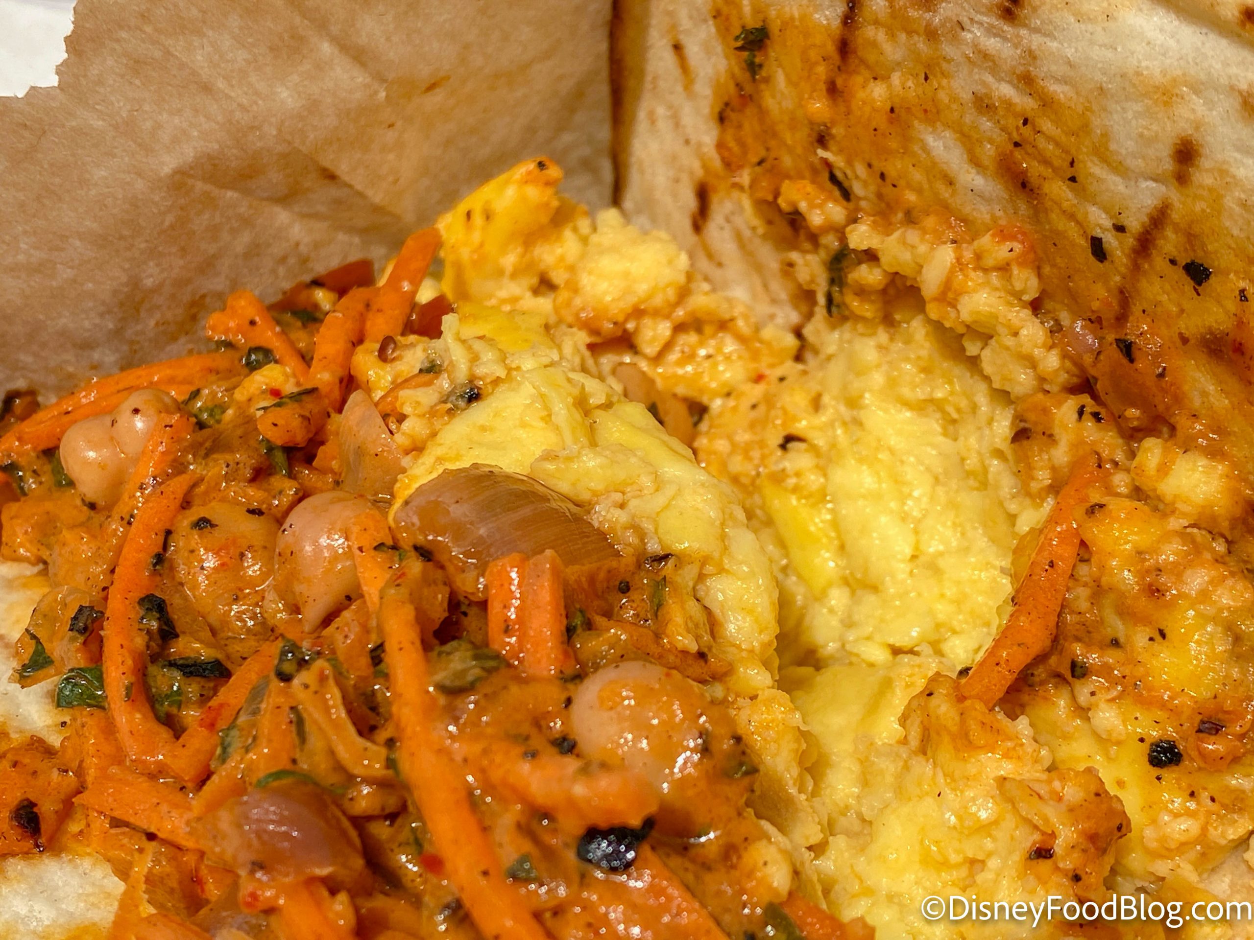Other than the spice, there are a lot of different flavors going on when you bite into the wrap. But, what we enjoy most about it is the smoky chickpea onion slaw. We could eat a whole TUB of that with just the pita bread and be happy! If you’re not a meat eater and are looking for something filling in the morning, this might be just the thing.