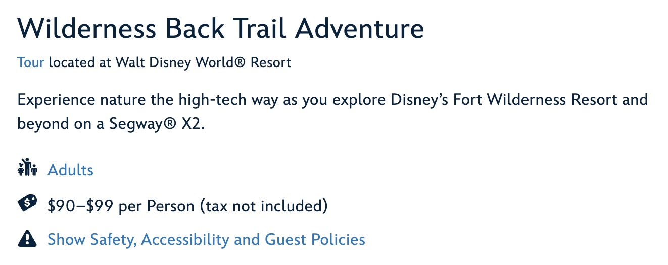 The Wilderness Back Trail Adventure at Fort Wilderness Resort will run you $90-$99 per person.