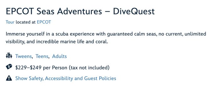 DiveQuest at EPCOT’s Seas Pavilion has increased and will be $229-$249 per person.