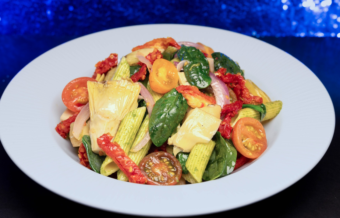 - Pesto Penne Pasta: Pasta tossed in house-made pesto sauce with sun-dried tomatoes, rainbow cherry tomatoes, grilled artichoke hearts, onions, and spinach (Plant-based)