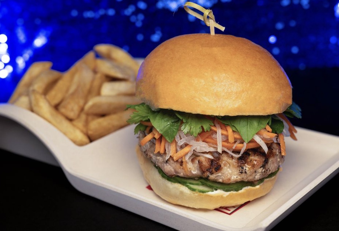 - Bánh Mì Burger: Grilled house-made pork patty topped with roasted pork belly, pickled vegetables, cucumber, herbs, and a sriracha aïoli