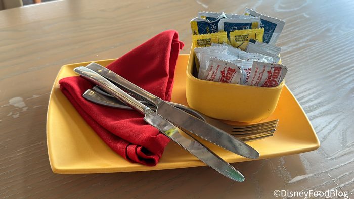 Once your server has made contact with you they will bring out the silverware, condiments, and napkins to your table.