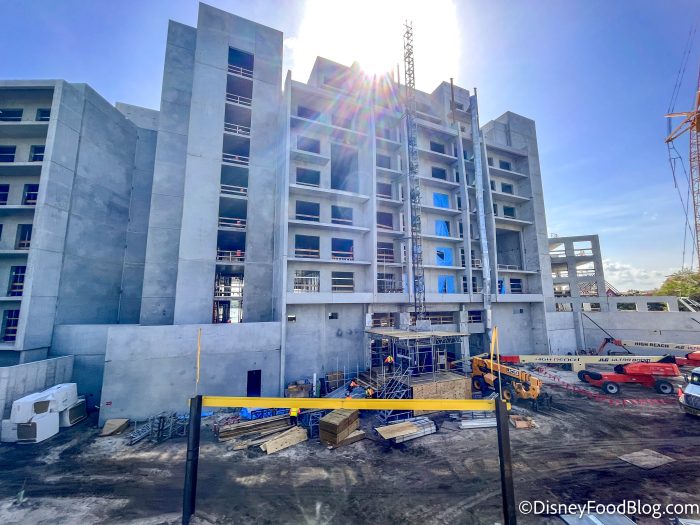 Disney’s Polynesian Village Resort is also undergoing a major overhaul. Disney is currently in the process of expanding this resort to include more Disney Vacation Club villas, which will bring new recreation and dining options. We’ve seen a large portion of the building going up in the past few months. This is what the construction site looked like in July 2023. At the time, we noticed a lot more equipment on the site. However, it’s not scheduled to finish until late 2024, so that’s a long time to deal with the construction!