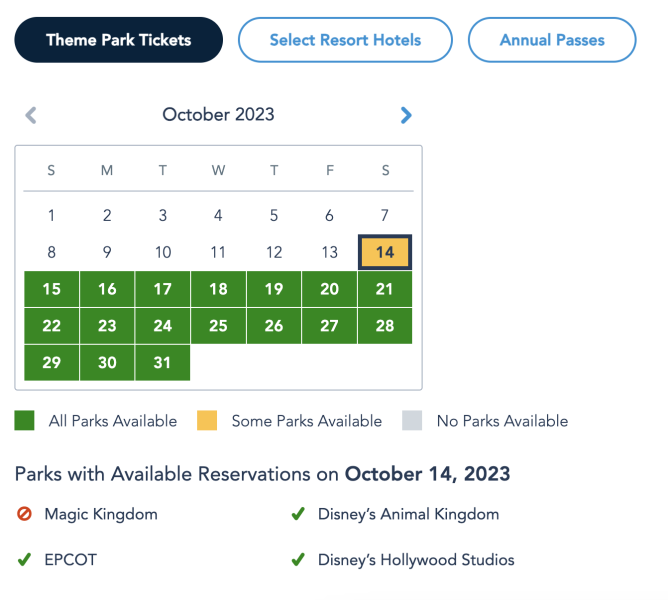 Park passes were available for EPCOT, Hollywood Studios, and Animal Kingdom, so if you were hoping to visit the parks you might still have a chance! We’ve also seen park passes sell out and then refill for Annual Passholders on October 16th in Magic Kingdom, which is the official 100th anniversary of The Walt Disney Company. Disney hasn’t announced any special events for this date in Magic Kingdom, but we’ll keep an eye out!