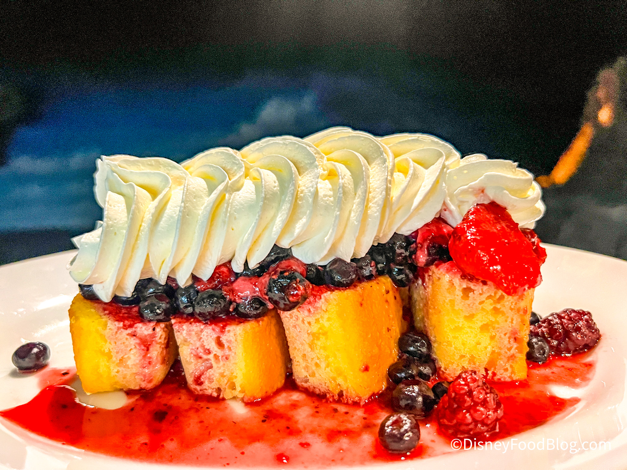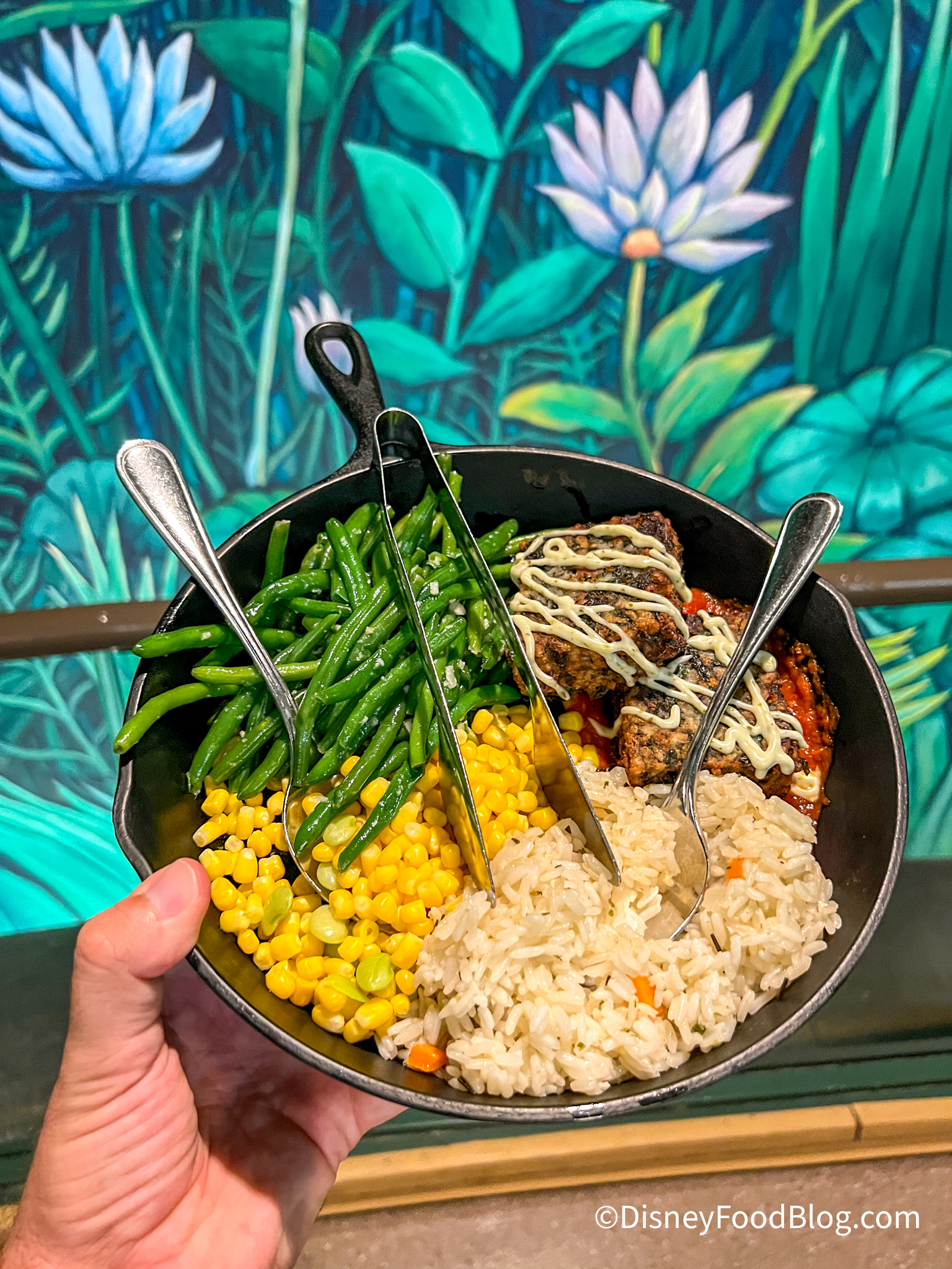 For the plant-based main course, the Veggie Loaf really hit the mark for us. We would make it one of our top three plant-based options in Disney World, so that’s definitely saying something! The inside is rice and vegetables while the outside is fried. There is both a chunky tomato sauce on the bottom and also a white sort of gravy sauce drizzled on top. All of the textures and flavors come together and really give your taste buds a workout in the best way.