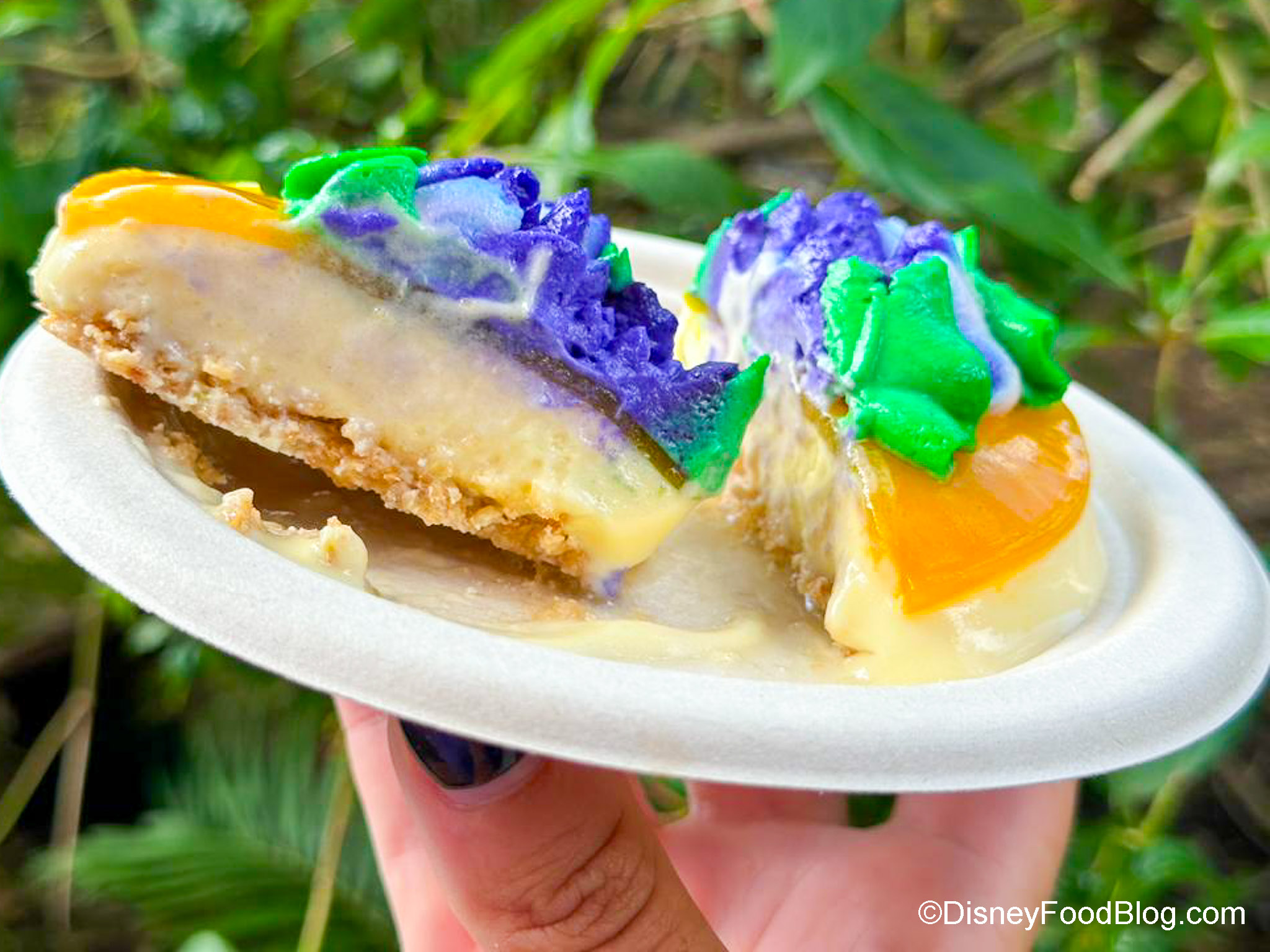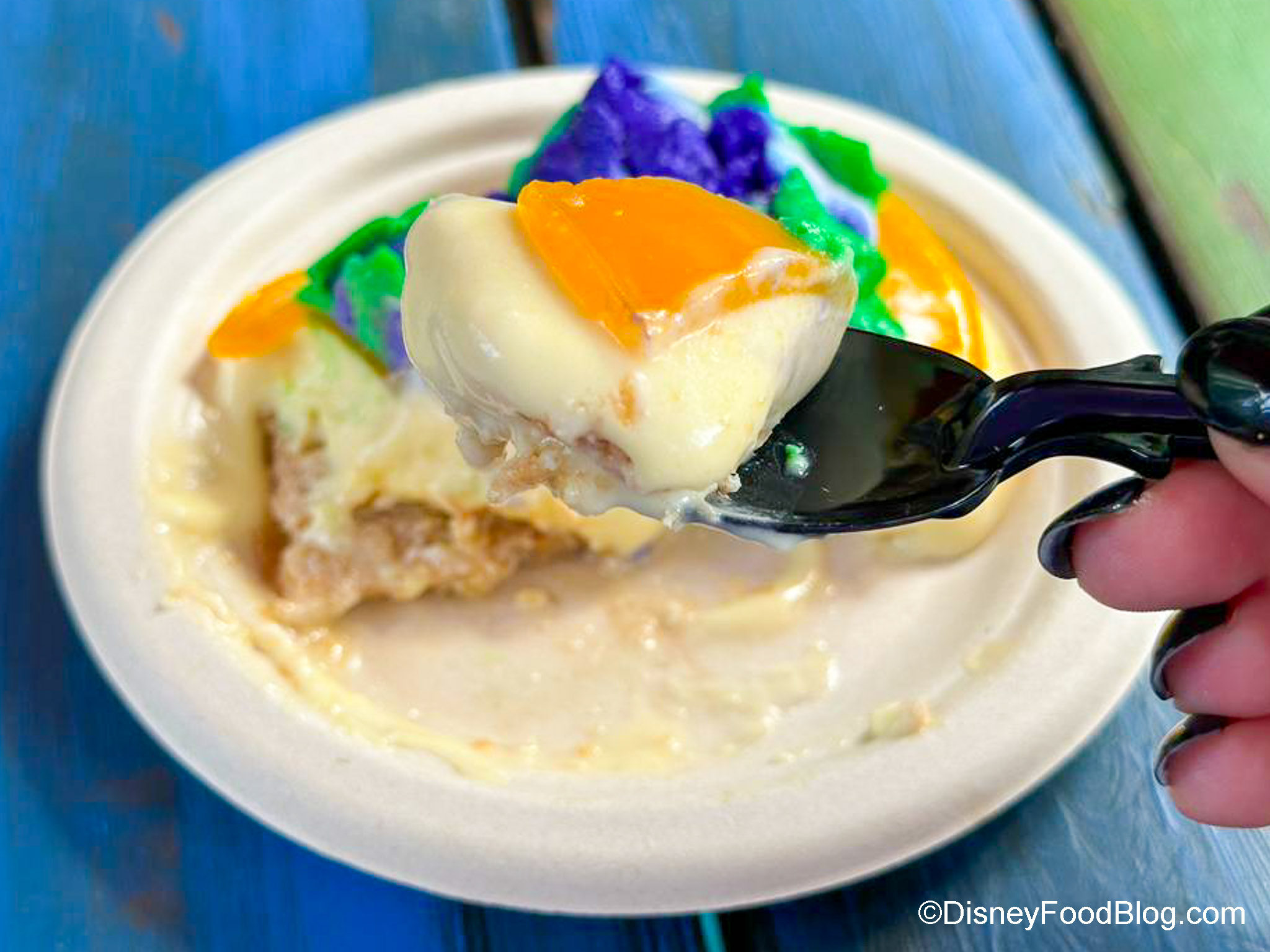 However, the cheesecake has a great flavor that is smooth and creamy, without just a touch of tang. We also loved the passionfruit and mango, which added more tartness plus we LOVE that Disney decided to do a whipped topping over a buttercream frosting — but it will also melt fast.