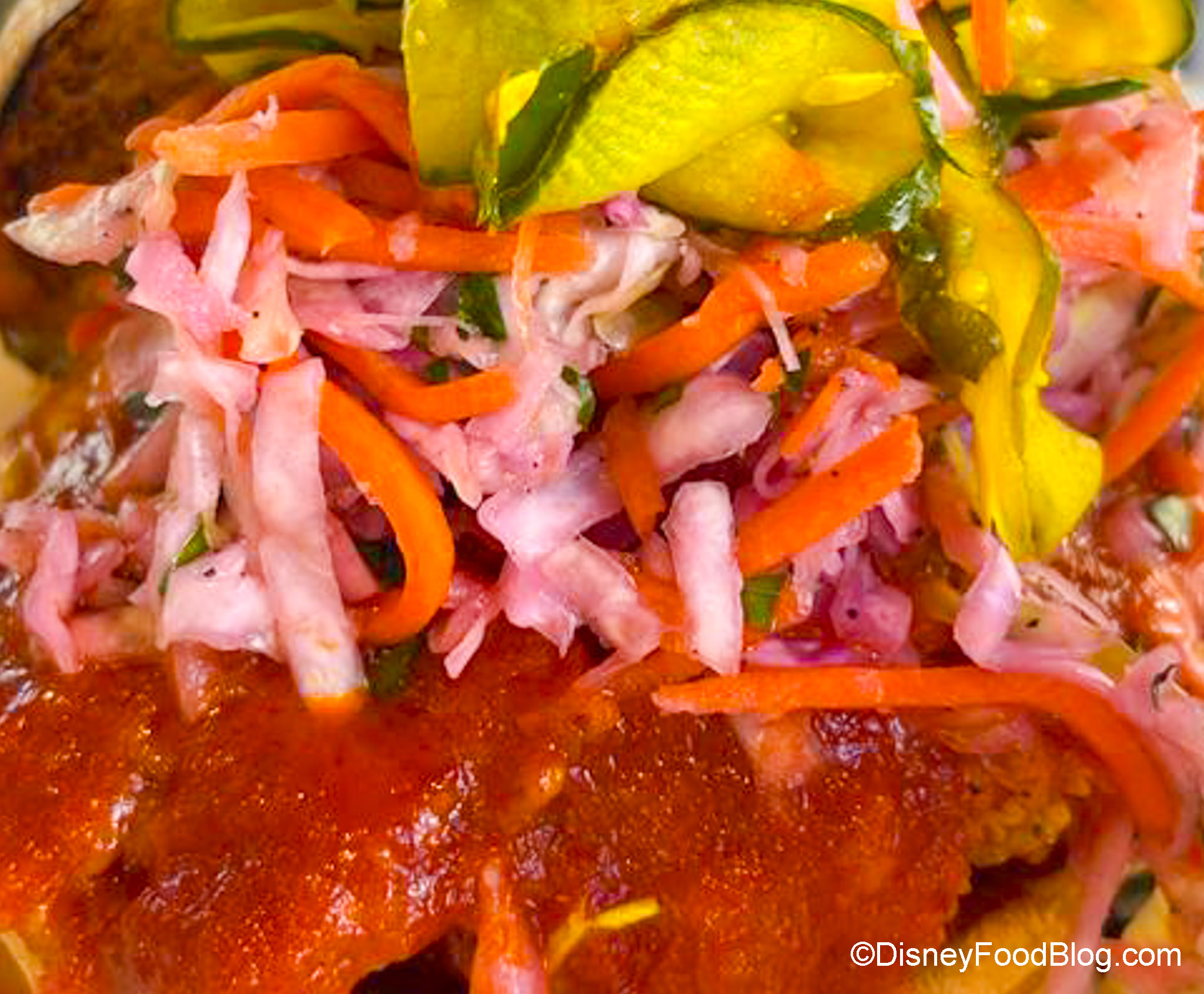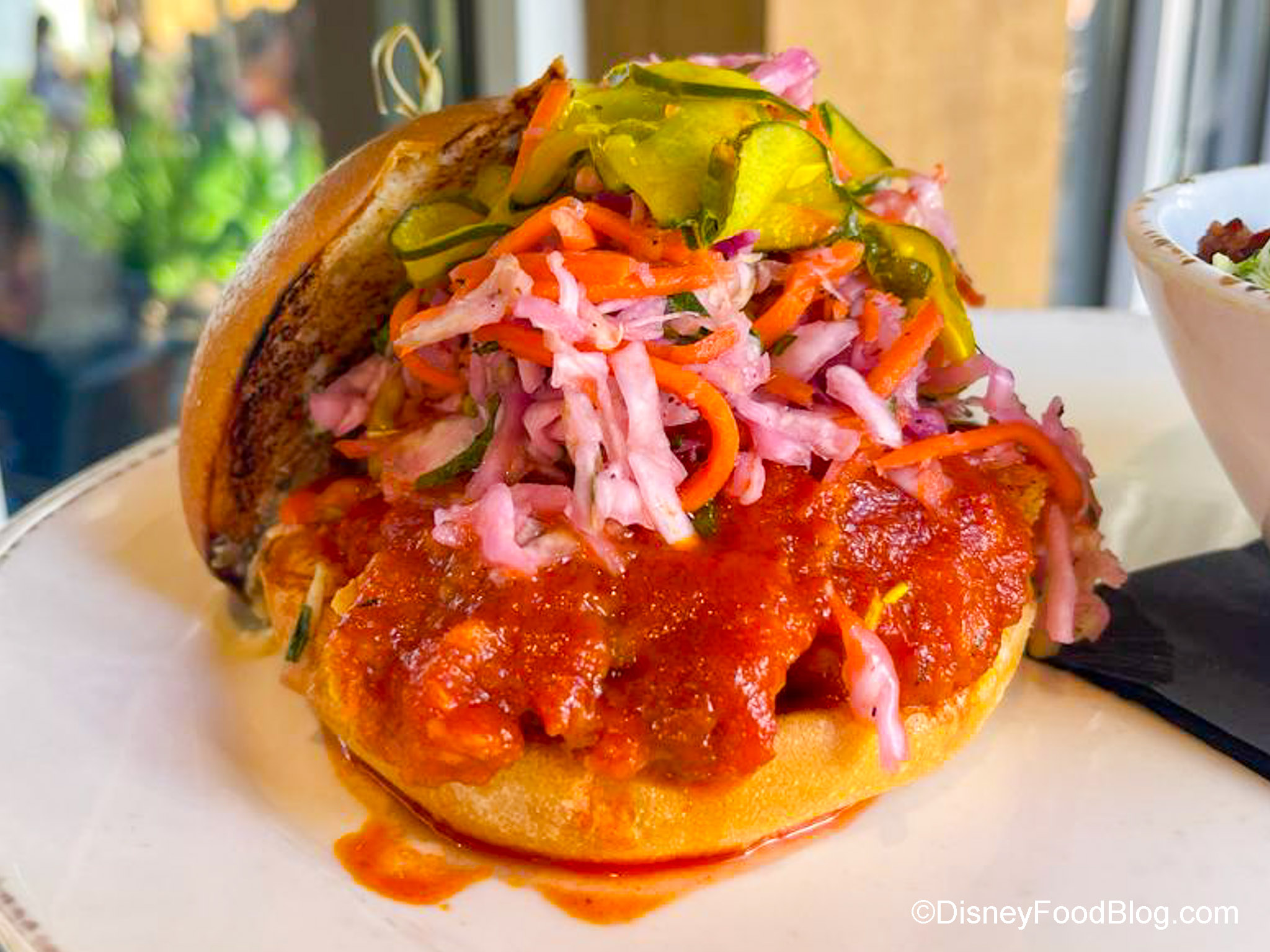 We didn’t mind having to eat it with a fork, though, because it was good. The spicy is more of a “Disney spicy” (so not too much heat at all), but the acidity from the crispy slaw and the sweetness of the pickles cut that down. We would say that this sandwich is sharable if you’re not super hungry.