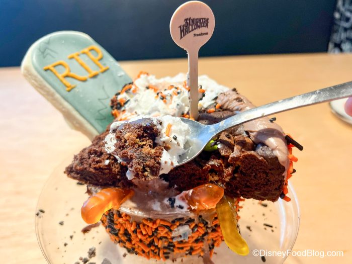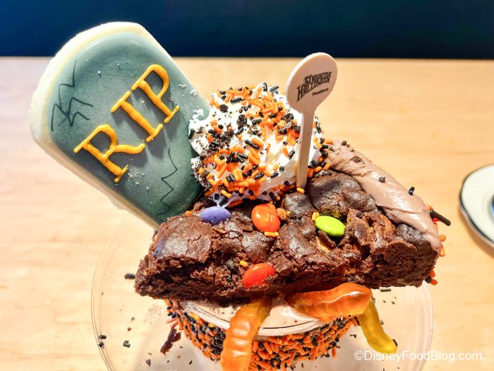 It’s a mud pie milkshake with a chocolate frosted rim with orange and black sprinkles, topped with an M&M cookie pie, gravestone cookie, crumbled Oreo, gummy worms, whipped cream, orange and black sprinkles, and chocolate shavings for $26. That’s pretty pricey for a shake, but when you think about all the desserts that are loaded on top, it’s definitely more than your average milkshake.