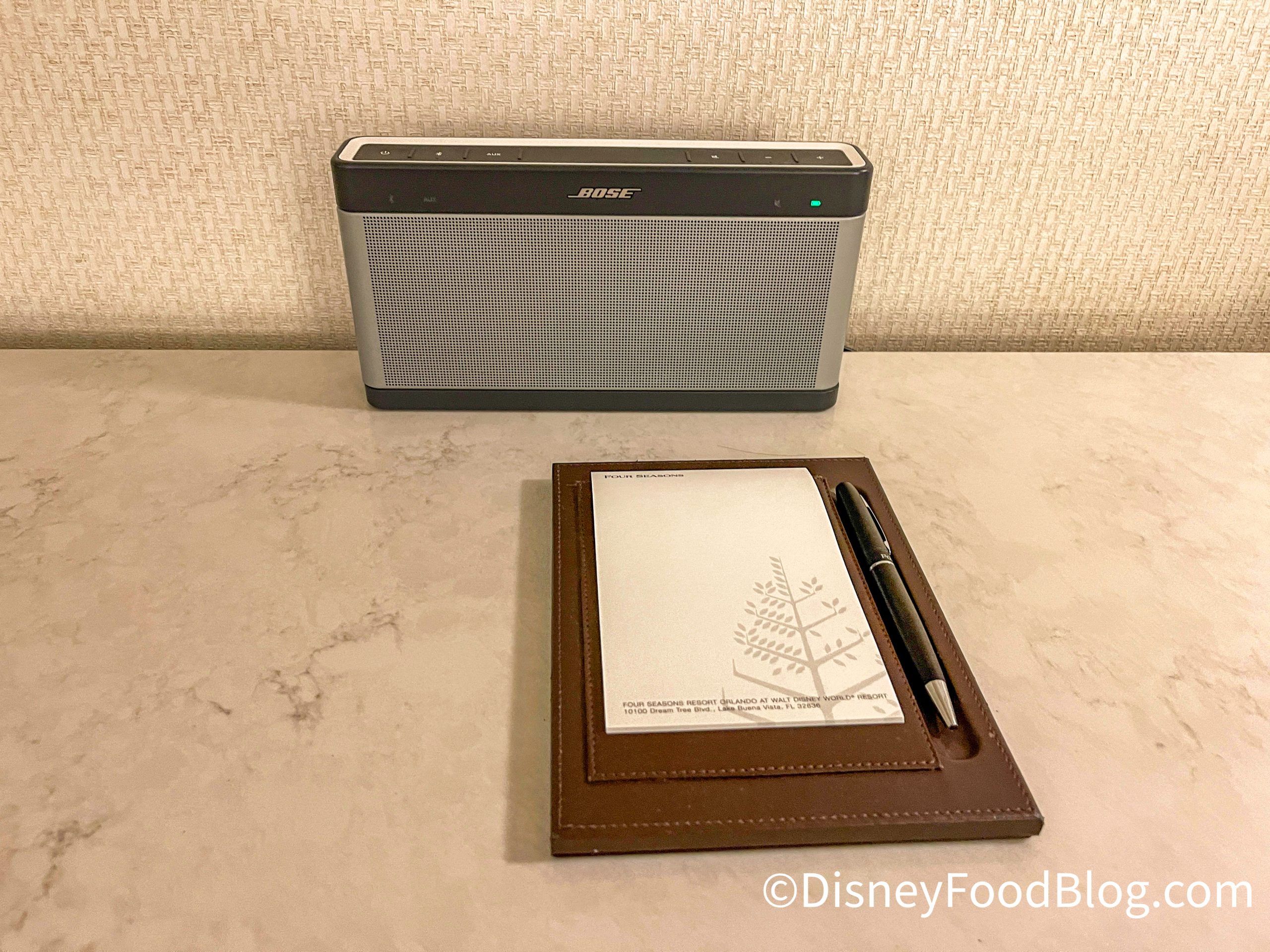 On the desk, you’ll find a noise machine and a pad of paper and pen.