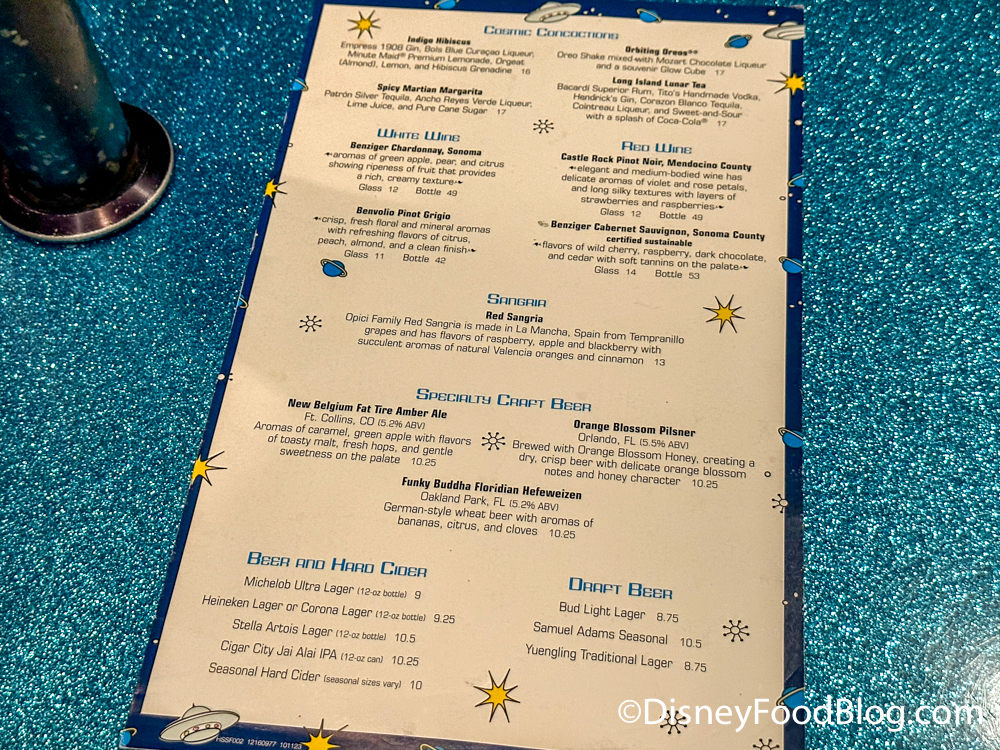 For drinks, you’ll find a selection of Cosmic Concoctions, Wine, Sangria, and Craft Beer.