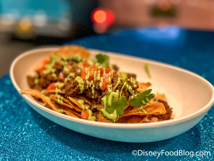 The Sci-Fi Impossible Nachos are Fried Tortilla Chips topped with plant-based black bean chili, avocado cream, pico de gallo, and cilantro. These are $13.