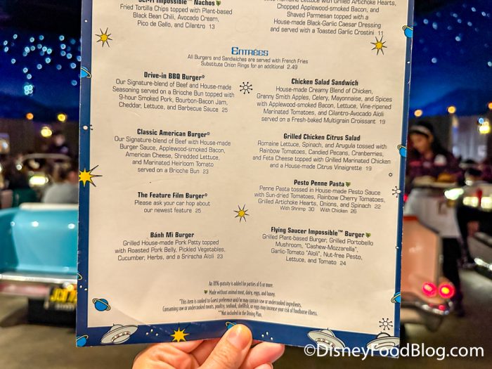 You also will find a few burgers on the menu! For Entrees, check out the Drive-in BBQ Burger, Classic American Burger, and the Flying Saucer Impossible Burger. There is also a Chicken Salad Sandwich, Grilled Chicken Citrus Salad, and a new Pesto Penne Pasta.