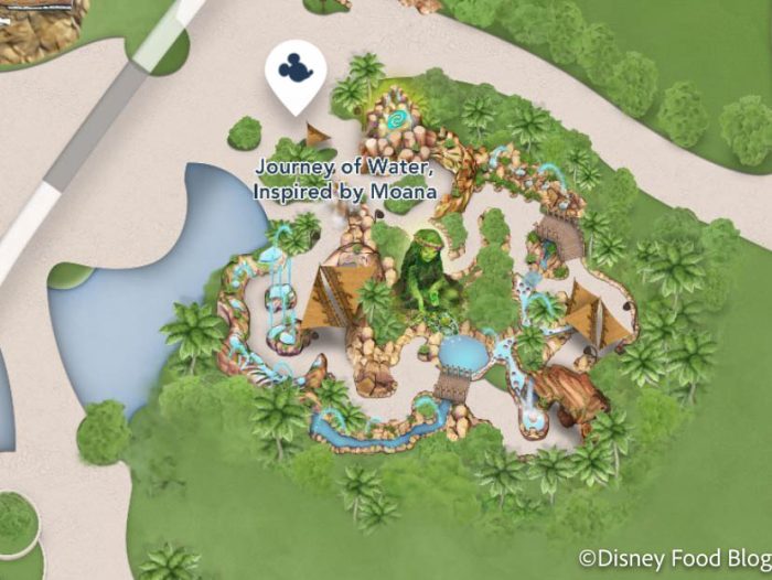 From there, we navigated on the map to the Journey of Water attraction and clicked on the Mickey head located right next to it.