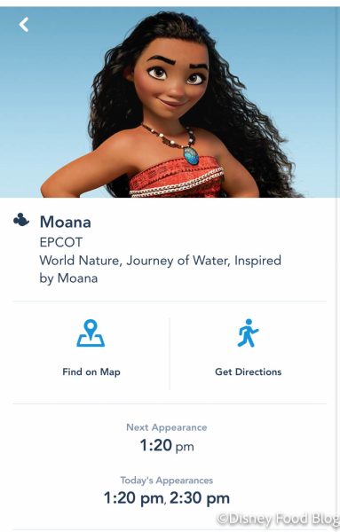 Then we were able to see the times that Moana would be out. Today, she was meeting guests at 9AM, 10:15AM, 1:20PM, and 2:30PM.