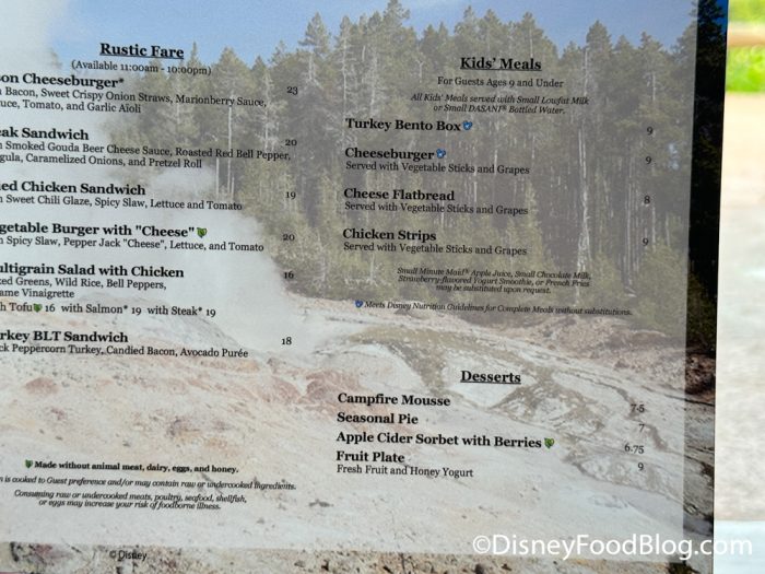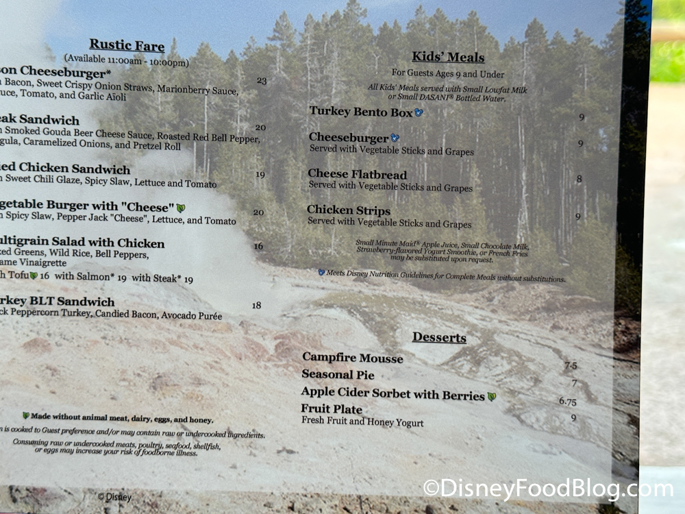 For kids, they have a few items, including the Turkey Bento Box, Cheese Flatbread, and Chicken Strips. The Dessert menu includes the Campfire Mousse, Apple Cider Sorbet with Berries, a Fruit Plate, and a Seasonal Pie.