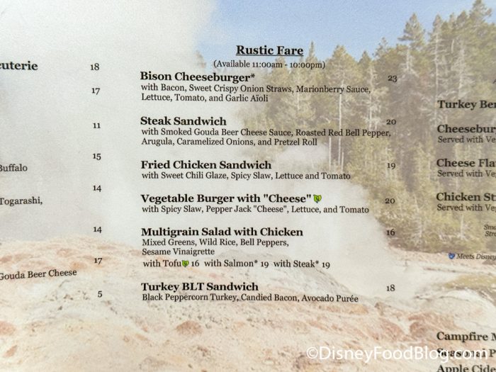 The Rustic Fare Section has some staples, like the Bison Cheeseburger, and a few new items like the Vegetable Burger with ‘Cheese’ and the Multigrain Salad with Tofu.