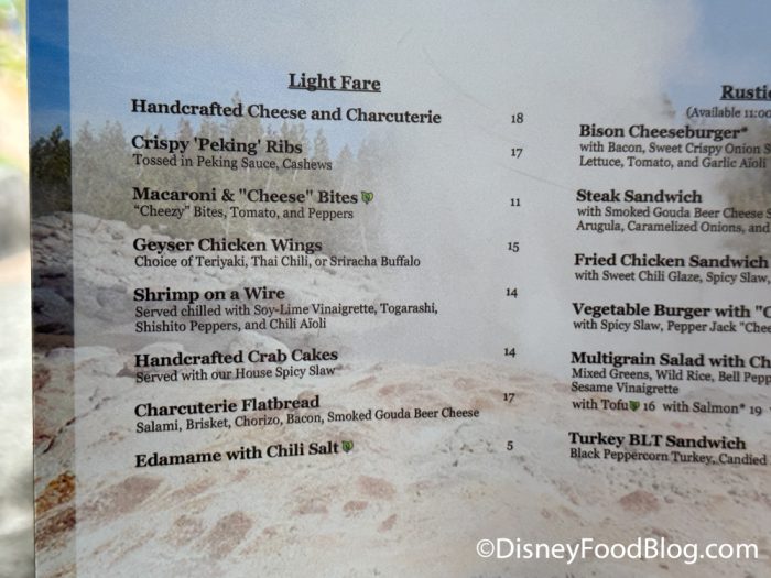 The Light Fare section includes some new items: Crispy “Peking” Ribs, Charcuterie Flatbread, and Macaroni & “Cheese” Bites.
