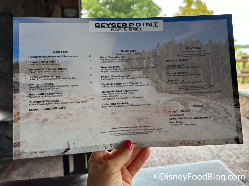 Seasonal sweets, celestial meals, boozy takes on classic snacks — how do you choose? If you’re looking to dine on some tasty food in the open air, with a beautiful view to boot, Geyser Point Bar & Grill is worth a visit. Overlooking Bay Lake in a stunning setting themed to the Pacific Northwest, this spot has both a Quick Service walk-up counter and a Table Service lounge. They recently added some new items to their menu, so I decided to check them out — read on for the full review!