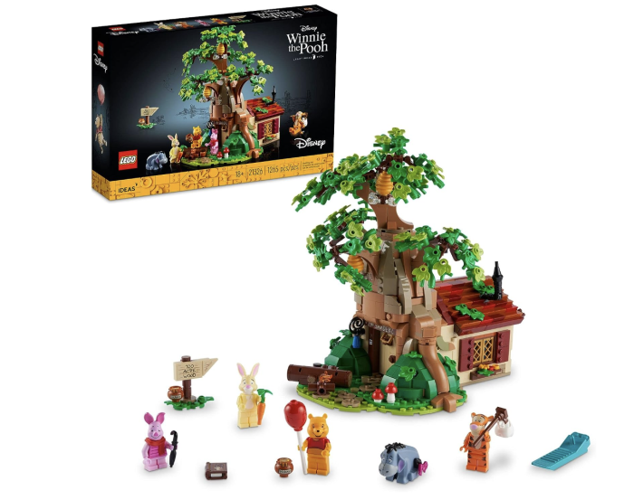 Several accessories are included, like a buildable armchair, a Pooh-Coo clock, honey pots, and Pooh’s red balloon. Five character minifigures are included as well: Winnie the Pooh, Piglet, Tigger, Eeyore, and Rabbit.