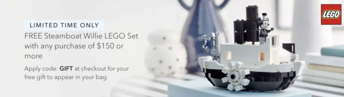 Also, don’t miss out on getting a “FREE Steamboat Willie LEGO Set with any purchase of $150 or more“.