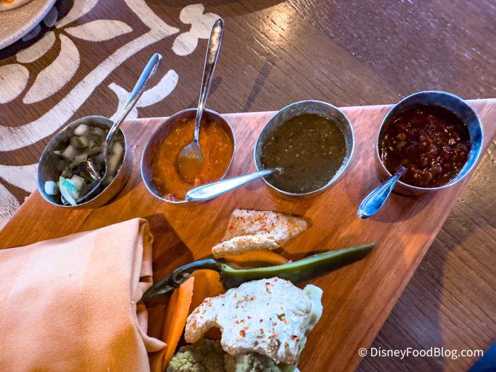 Finally, for dessert we got an order of the Warm Churros. We know, we know, Disney World is NOT known for great churros. But these, we might say, are some of the best churros on property. These are coated in espelette sugar and come with three sauces — spiced chocolate sauce, tequila caramel, and mango-chamoy sauce.