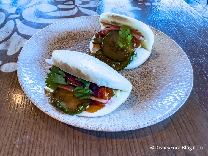 First, we ordered the Fried Chicken Bao Buns. These have lime mayo, sweet-and-spicy gochujang sauce, ‘kimchi’ pickles, and radish. They come with two buns, and they pack a lot of flavor into that small serving.