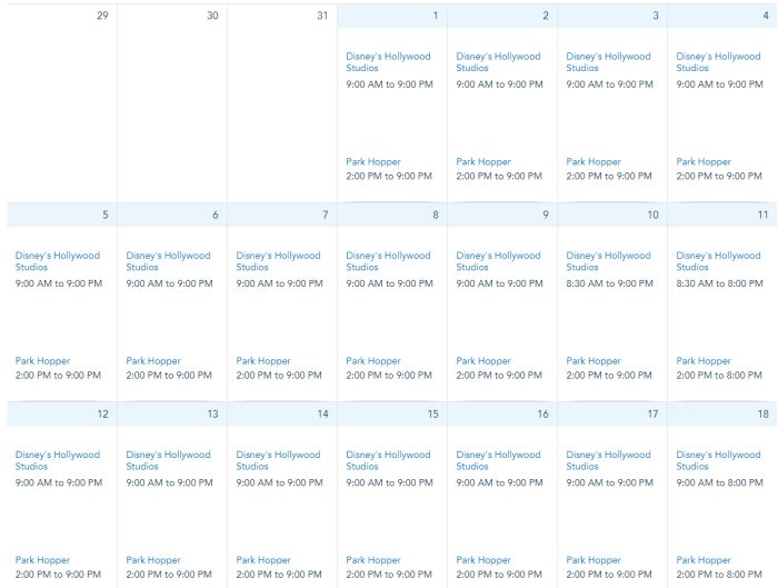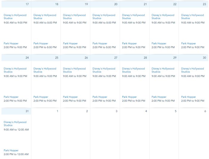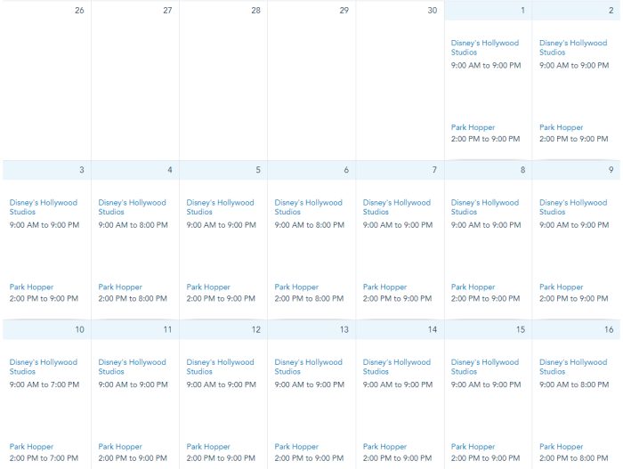 Hours at Hollywood Studios are from 9AM to 9PM on December 1st through 5th, 7th through 9th, 11th through 15th, 17th, and 21st through 30th. Hours are from 9AM to 8PM on December 6th, 16th, 18th, and 20th. Hours are from 9AM to 7PM on December 10th.