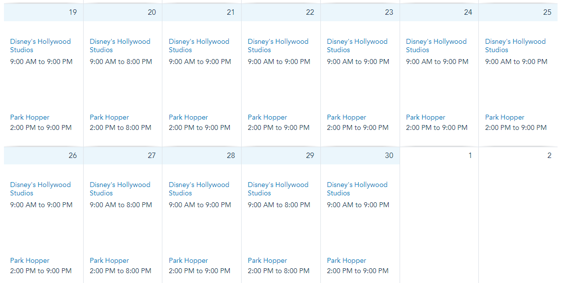 Hollywood Studios is open from 9AM to 9PM on November 1st through November 9th, 12th through 17th, and 19th through 30th.