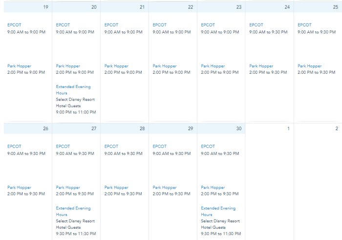 EPCOT’s hours in November are from 9AM to 9PM every day…
