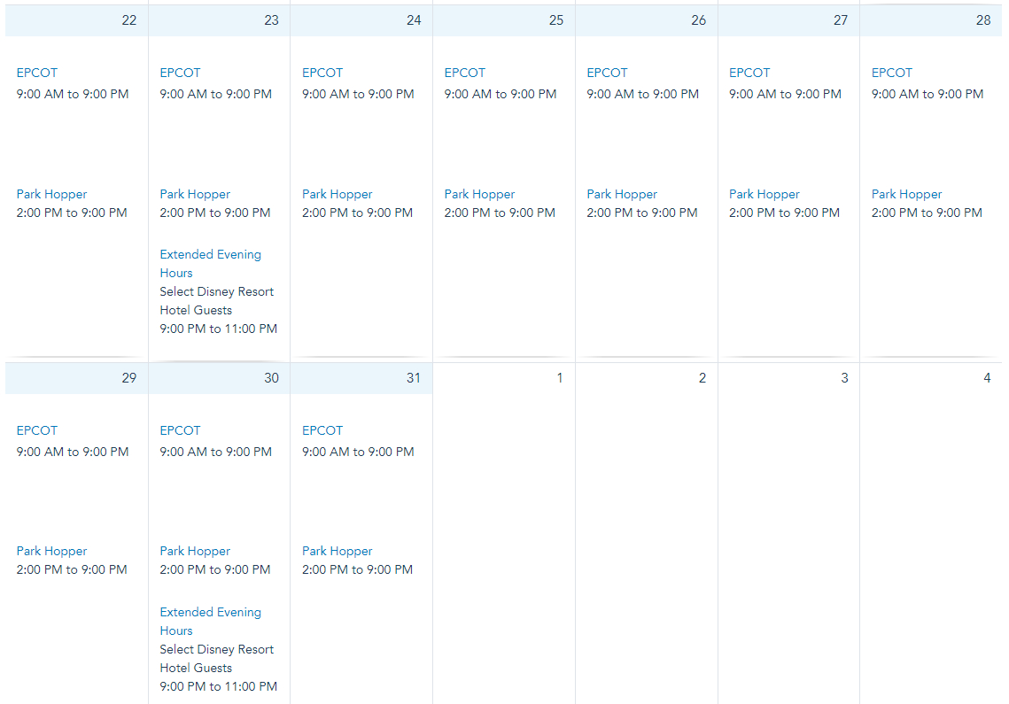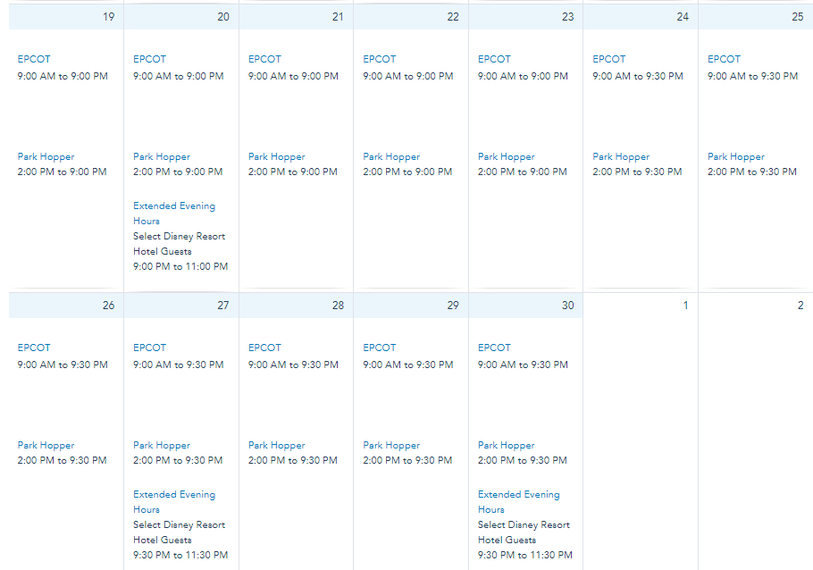 In October, EPCOT is open every day from 9AM to 9PM. Extended Evening Hours are on October 23rd and 30th from 9PM to 11PM.