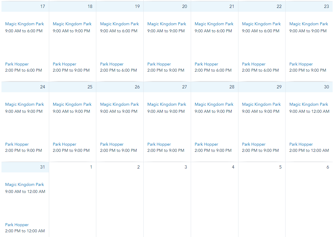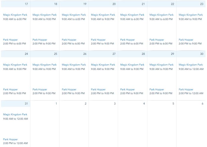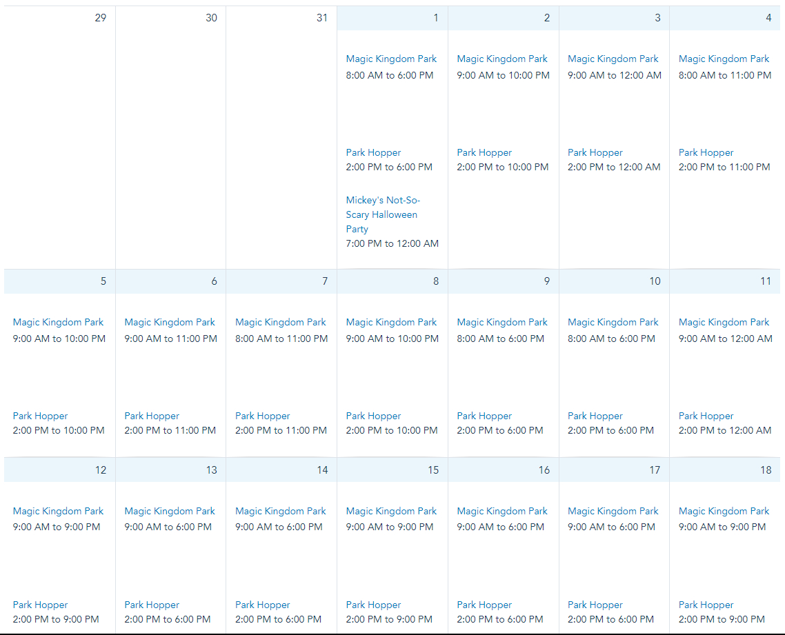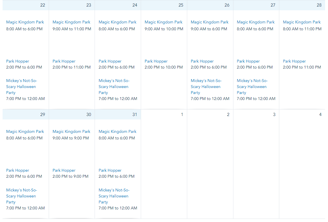 On October 22nd, 24th, 27th, 28th, 29th, and 31st, Magic Kingdom will be open at 8AM. Note that Mickey’s Not-So-Scary Halloween Party will have Magic Kingdom closing at 6PM on October 22nd, 26th, 27th, 29th and 31st. Magic Kingdom is open from 9AM to 11PM on October 23rd and from 9AM to 10PM on all other days in October.