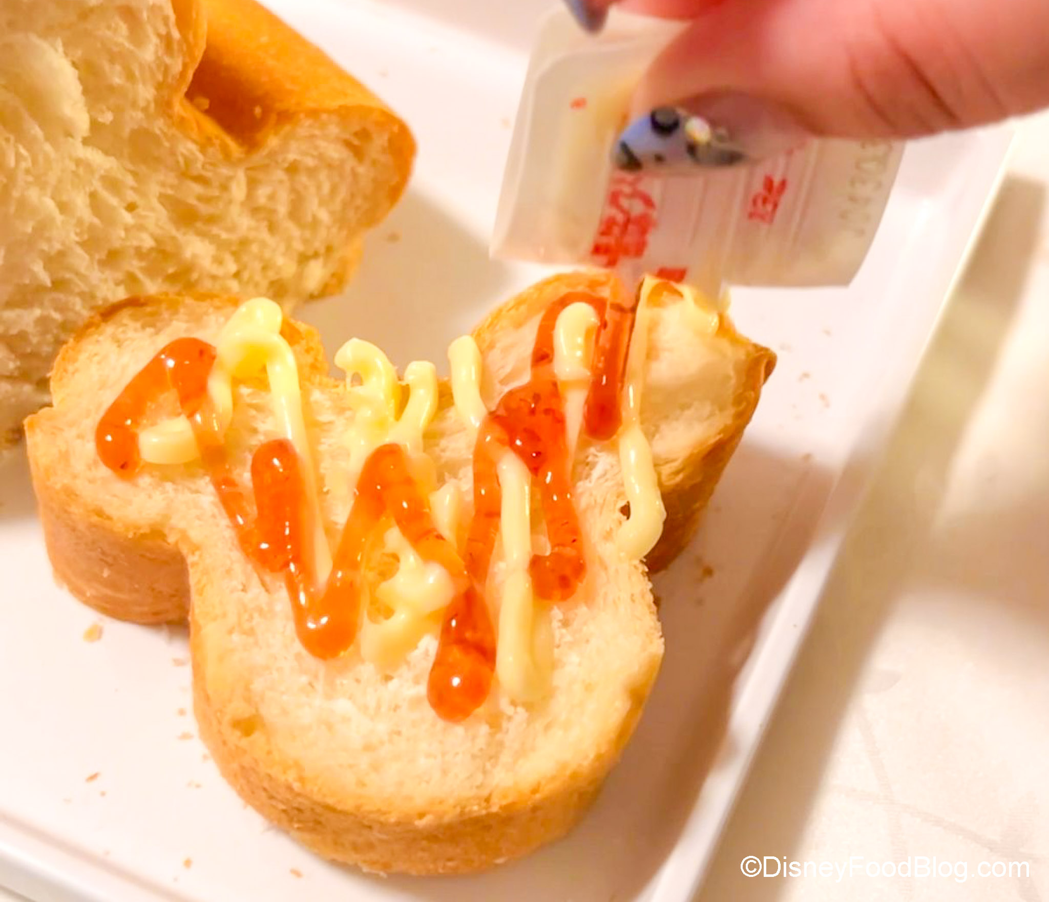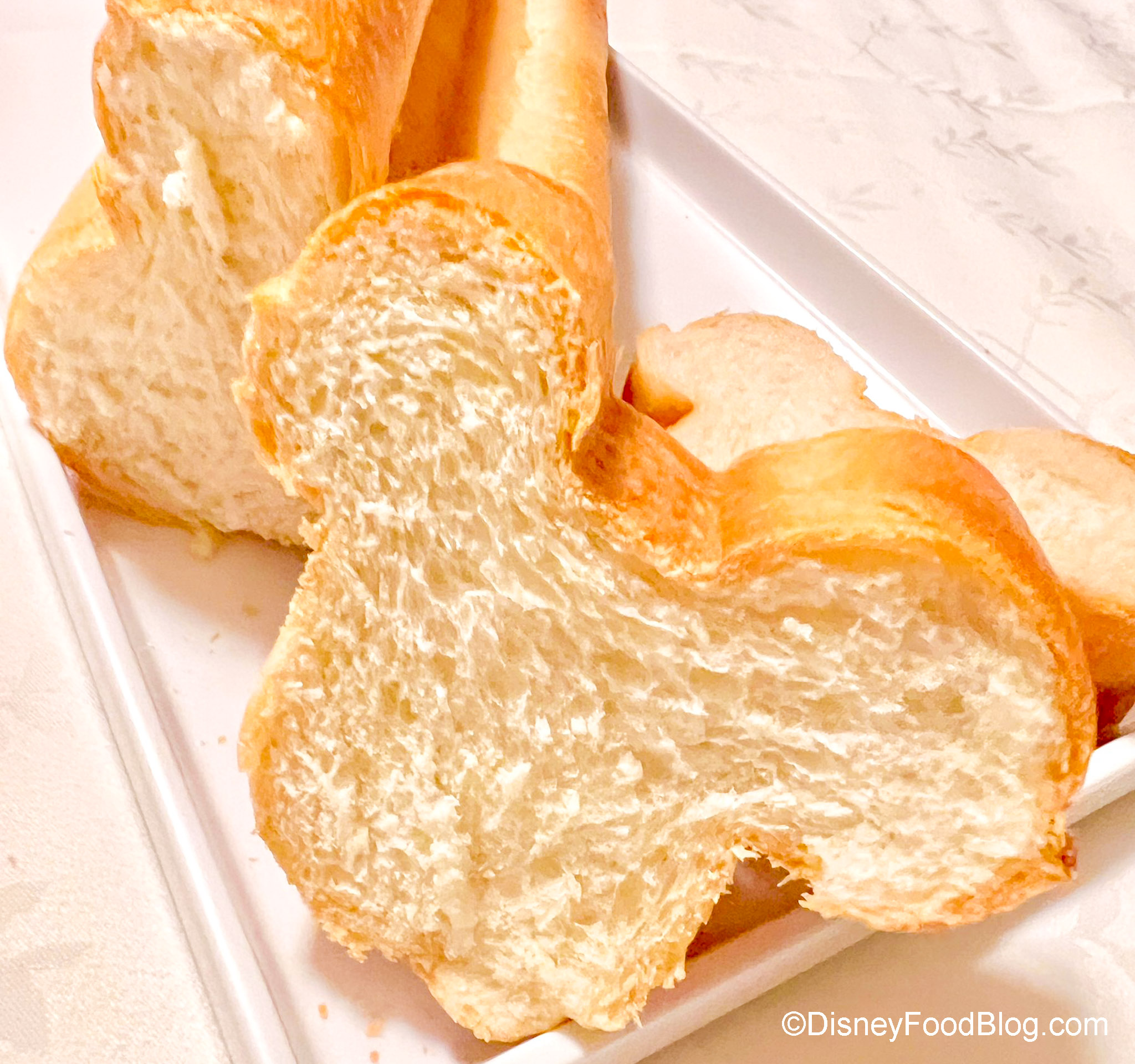 The bread isn’t warm when you get it — it’s basically pre-packaged bread, but we thought the texture was soft and it still tasted fresh. Plus — when you slice it, you get little Mickey-shaped bread slices. How fun is that?