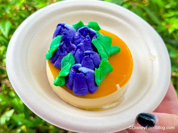 There was just one new treat at Magic Kingdom: the Passion Fruit IceOform at the Energy Bytes snack stand near TRON Lightcycle / Run. It’s Ice Cream Mochi with Citrus, Shortbread Crunch, and Purple Ube Foam.