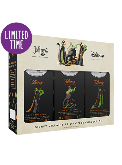 This trio pack of coffee comes with three different flavors that represent some of our favorite Disney VILLAINS! Each bag is 11oz and has its own unique flavor that is sure to please.