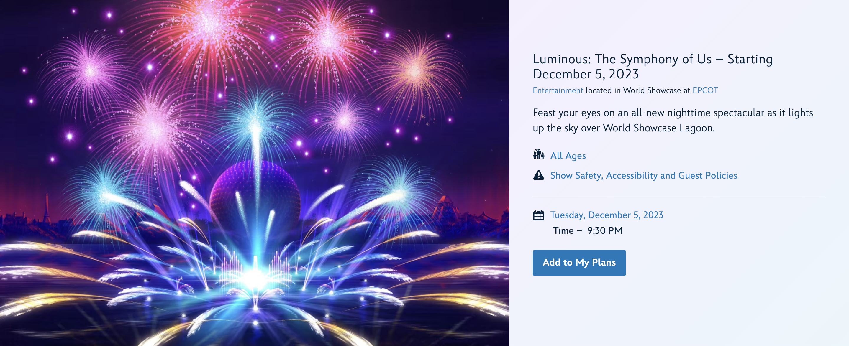 On the Disney World website, showtimes are now listed for Luminous. Starting on December 5th, you’ll be able to catch this show at 9:30PM!