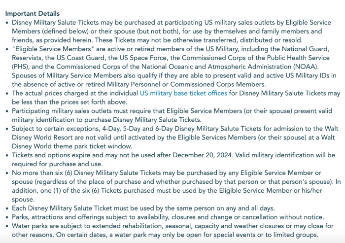 This discounted ticket promotion (which was formerly known as the Disney Military Promotional Ticket) is offered to eligible Military members for use by themselves and family members and friends.
