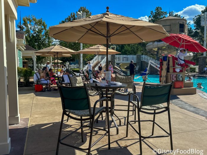 The seating at Paddock Grill is open-air and set up around the pool deck. Most of the tables have 4 chairs and a large umbrella to offer some shade from the sun. There’s not a ton of seating though, so if this were a busier day, I could see you having trouble finding a table and taking the food back to a pool lounge chair with you.