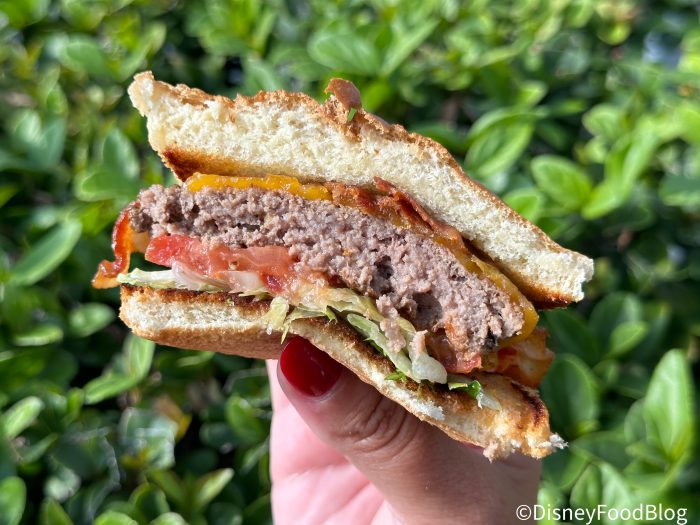 If you’re looking for a familiar staple, this should be your pick! It’s a fairly standard Disney World burger with the added melted cheddar cheese and two long bacon slices.