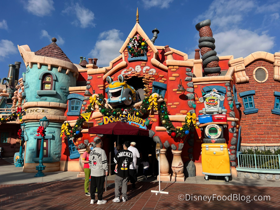 We think it’s a ton of fun that the theming extends to the attractions in Toontown. Next time you stop by Roger Rabbit’s Car Toon Spin, be sure to check out Roger high above the queue in his Santa outfit!