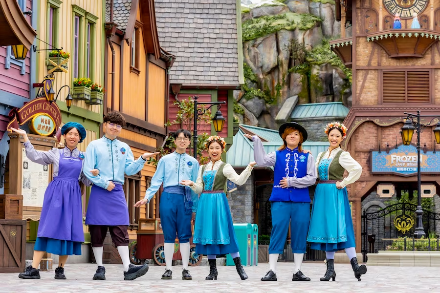 For Cast Members working in the Arendelle part of World of Frozen, the outfits have more floral themes with embroidery and styles inspired by the Vikings, as well as European baroque and rococo fashion.