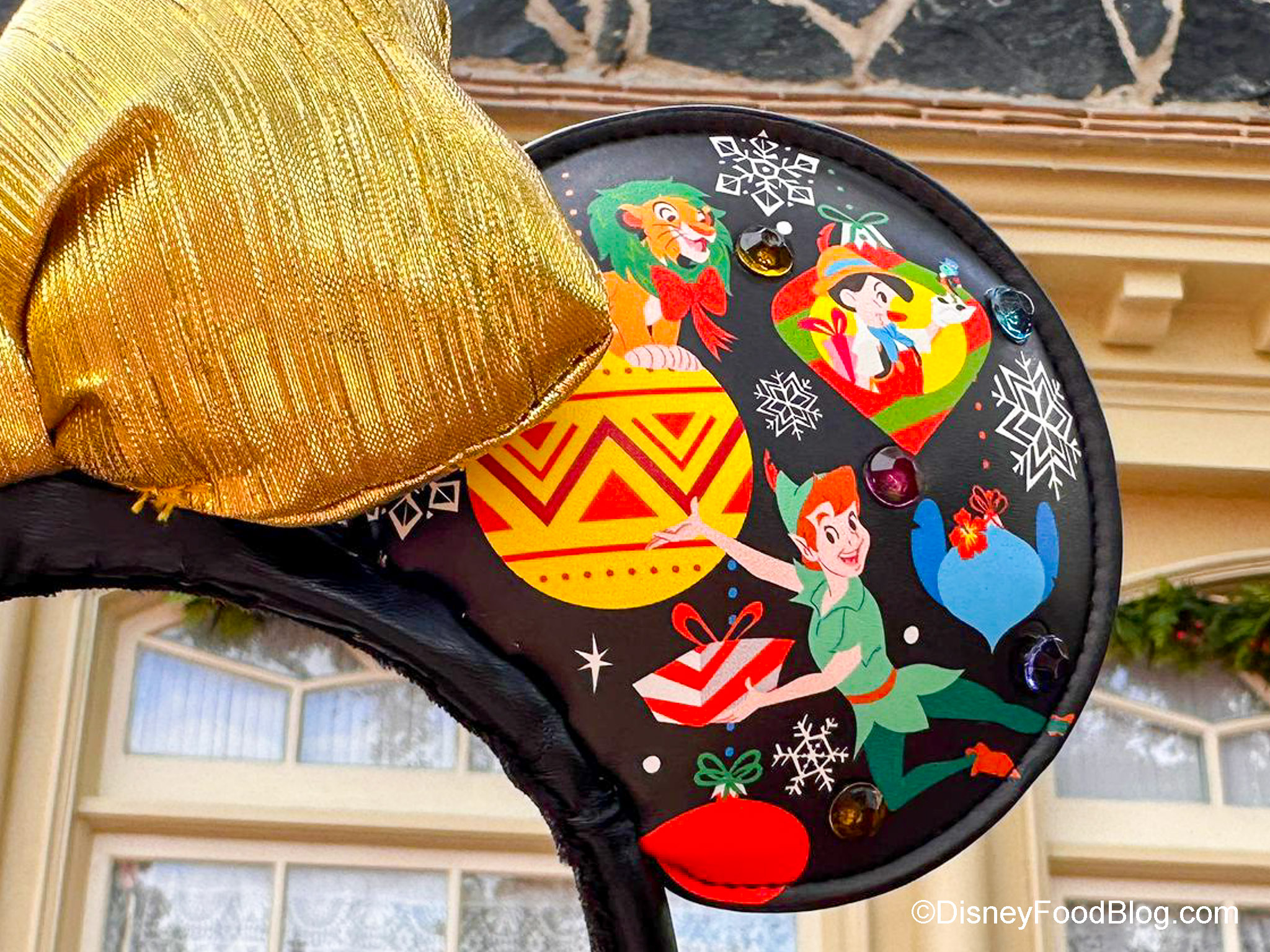 You’ll find Simba, Pinocchio, Jiminy Cricket, and Peter Pan on the other ear. Wait — is that a Stitch ornament we see? Yes, these ears also have ornaments and presents all over them. TOO FUN.