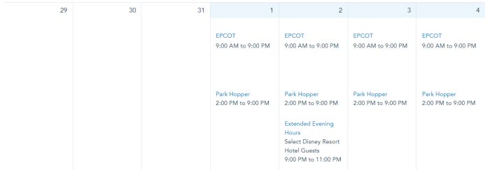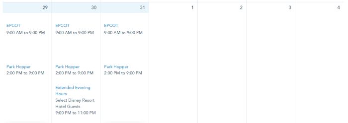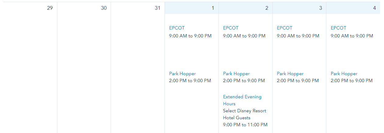 EPCOT is open from 9AM to 9PM throughout the rest of October. Extended Evening Hours are on October 30th from 9PM to 11PM.