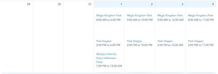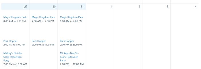 On October 29th and 31st, Magic Kingdom will be open from 8AM to 6PM. Note that the park closes early those nights for Mickey’s Not-So-Scary Halloween Party. Hours are from 9AM to 9PM on October 30th.