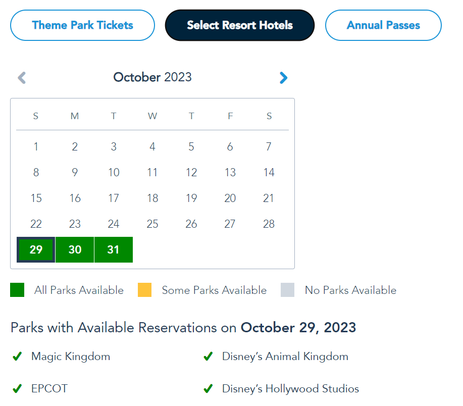 Let’s take a look at park pass reservations for the week, too. Availability is wide open for the week for both those with tickets, as well as those staying at resort hotels.
