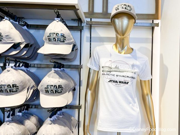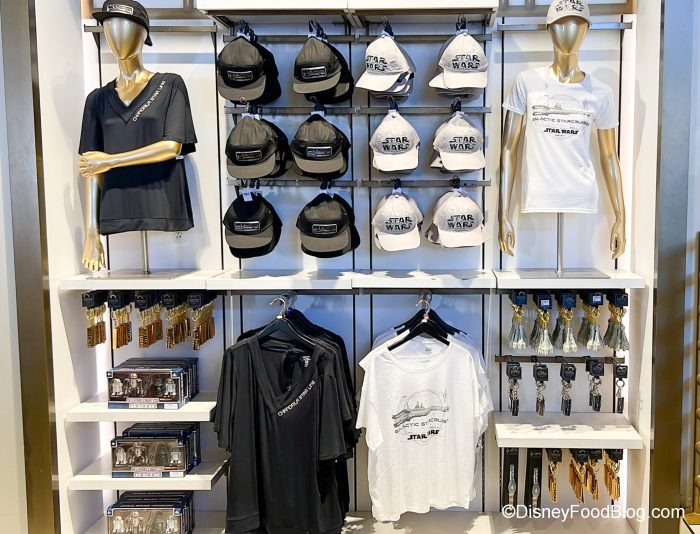 We were walking through Disney’s Hollywood Studios and stopped at Keystone Clothiers to see if we could find any new Disney merchandise. What we saw was a whole display of merchandise that was once ONLY available for those who visited the Star Wars: Galactic Starcruiser.
