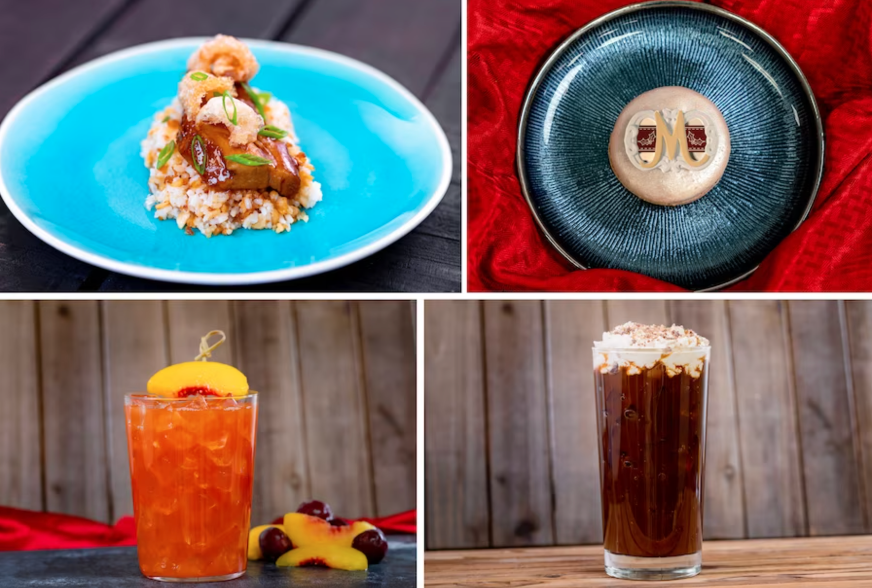 - Cherry Mango Punch: Mango purée, cherry and peach syrups, and lemon juice garnished with a frozen peach (Non-alcoholic beverage)
