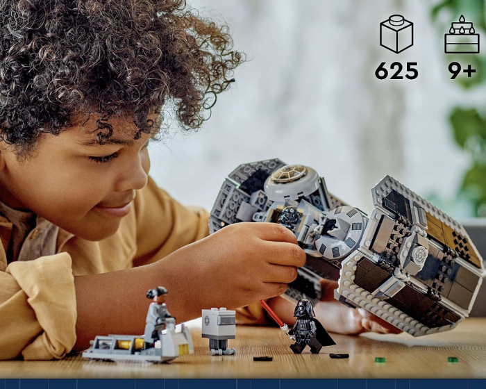 Star Wars fans will love this TIE Bomber LEGO Set, which is 625 pieces. The set comes with three minifigures and a Gonk Droid. The figures are Darth Vader with a lightsaber, Vice Admiral Sloane, and a TIE Bomber Pilot. The Bomber has an opening minifigure cockpit and a warhead bay with a torpedo-dropping function (it comes with six buildable torpedoes).