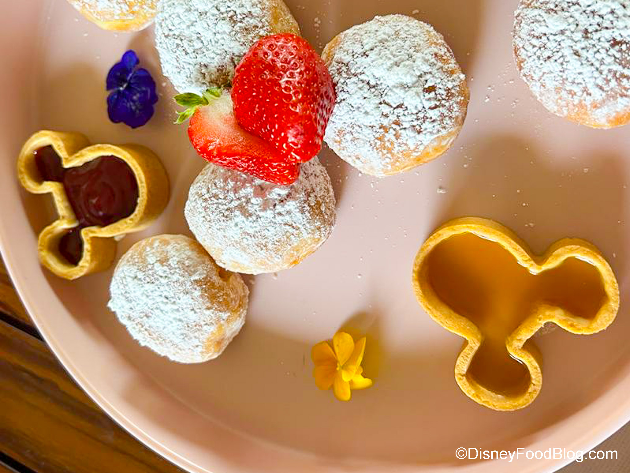 So, hey, who’s ready for dessert? We are! Okay, so Disneyland beignets are something of a legend, so we’re skeptical when ordering beignets that aren’t shaped like Mickey. For $15, you get six little beignets: two are filled with chocolate, two are mixed berry, and two are passion fruit. The sauces are raspberry, chocolate, and passion fruit.
